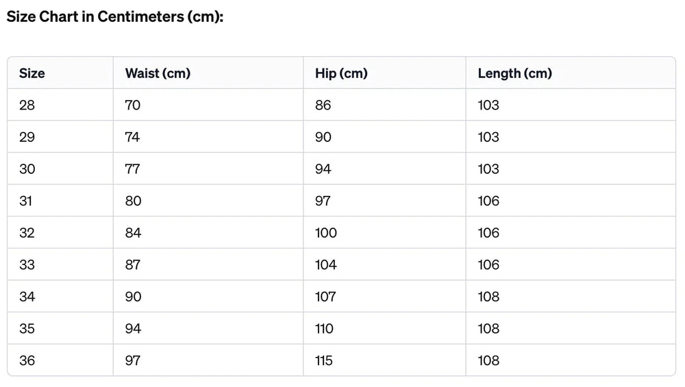 | Size | Waist (cm) | Hip (cm) | Length (cm) |