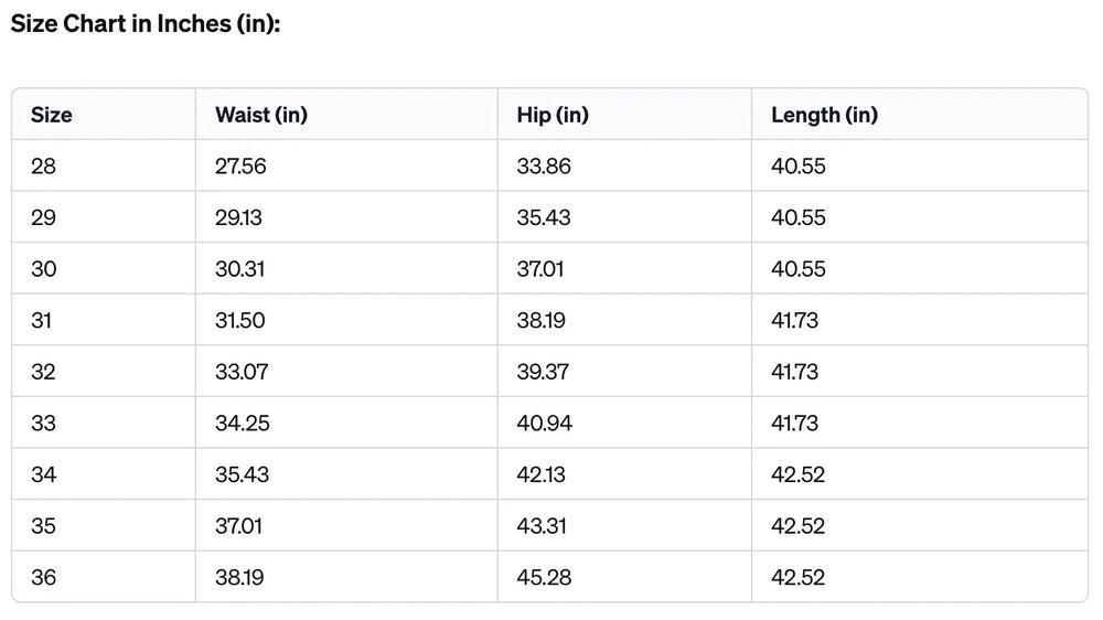 | Size | Waist (in) | Hip (in) | Length (in) |