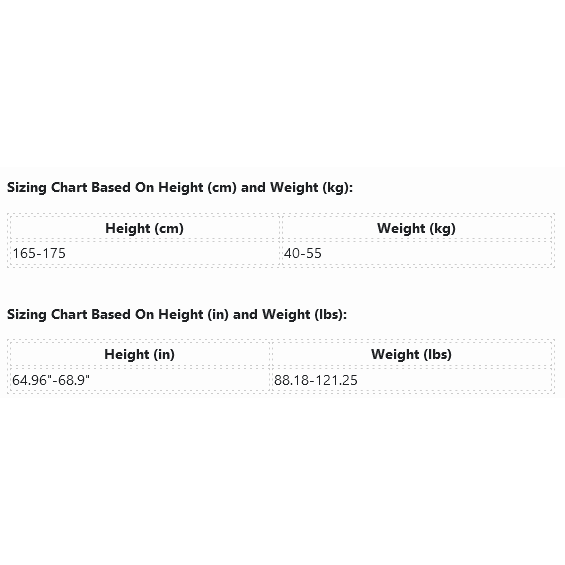 Sizing Chart Based On Height (cm) and Weight (kg):