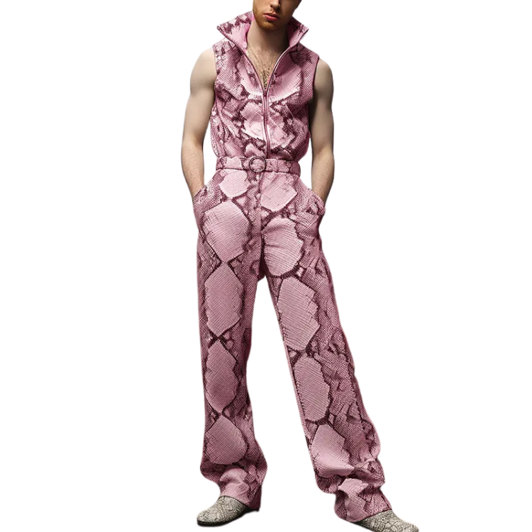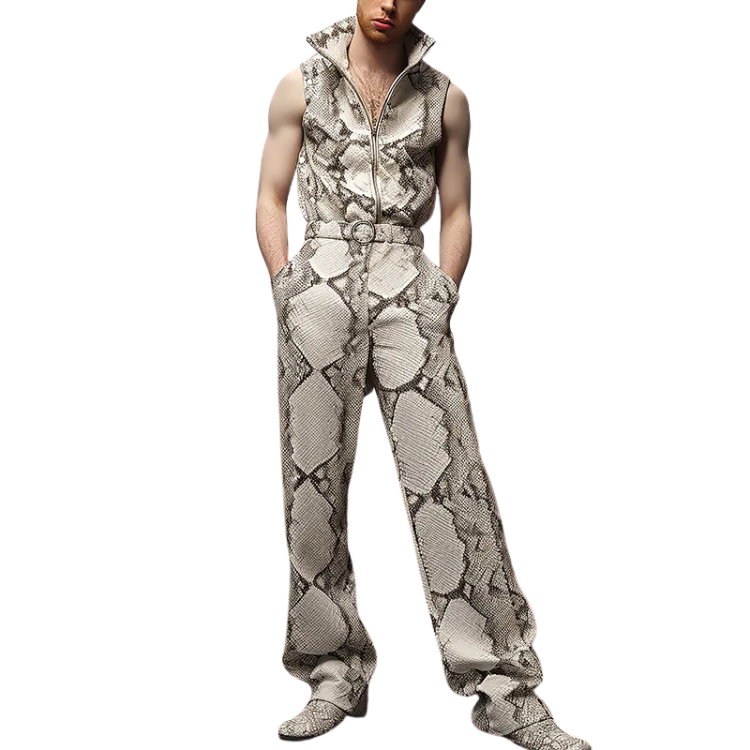 Crafted from sleek polyester, this piece captures the essence of the snake: alluring, powerful, and impossible to ignore. The lapel adds a touch of formal daringness, while the strategic zipper offers a customizable look that can switch from 'mildly mysterious' to 'wildly inviting' in just a pull. Embrace the full body embrace of these overalls, which promise to enhance your natural charisma and project your boldest self.