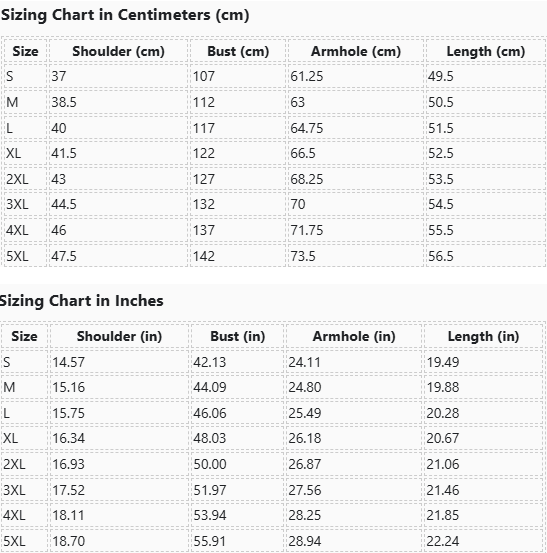 | Size | Shoulder (cm) | Bust (cm) | Armhole (cm) | Length (cm) |
