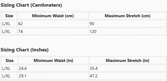 | Size | Minimum Waist (cm) | Maximum Stretch (cm) |