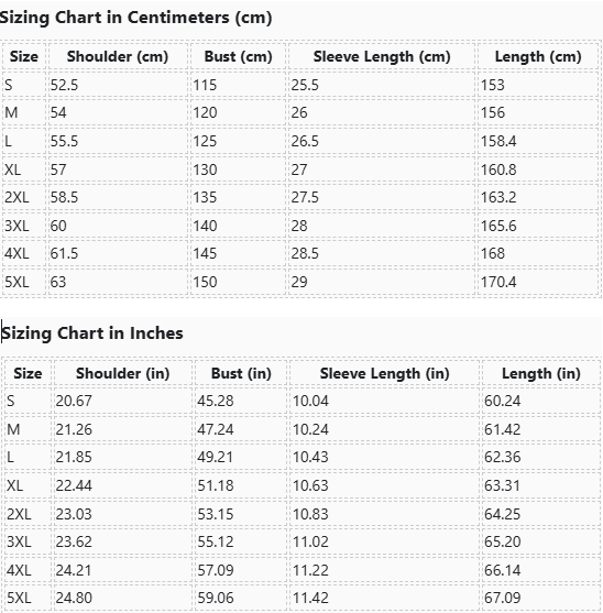 | Size | Shoulder (cm) | Bust (cm) | Sleeve Length (cm) | Length (cm) |