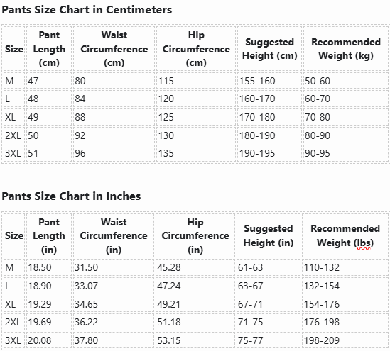 | Size | Pant Length (cm) | Waist Circumference (cm) | Hip Circumference (cm) | Suggested Height (cm) | Recommended Weight (kg) |