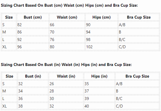 Sizing Chart Based On Bust (in) Waist (in) Hips (in) and Bra Cup Size: