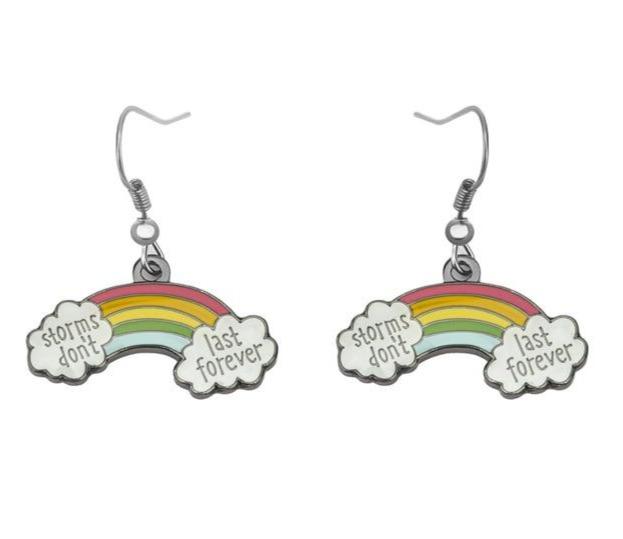 Wear these earrings and be an inspiration to everyone you encounter. They are made in a rainbow design with clouds that bear the saying “Storms Don’t Last Forever.”