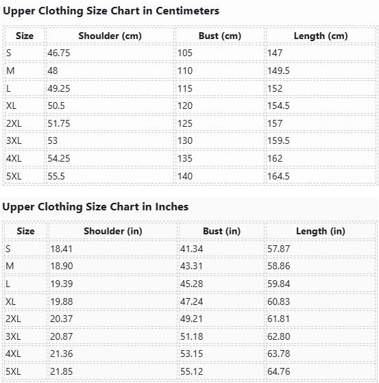 | Size | Shoulder (cm) | Bust (cm) | Length (cm) |