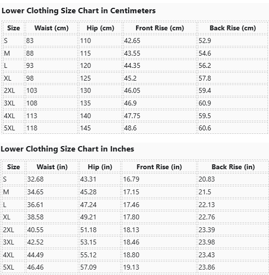 | Size | Waist (cm) | Hip (cm) | Front Rise (cm) | Back Rise (cm) |