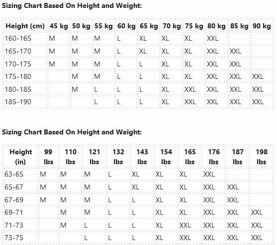 | 170-175 | M | M | M | L | L | XL | XL | XXL | XXL | |