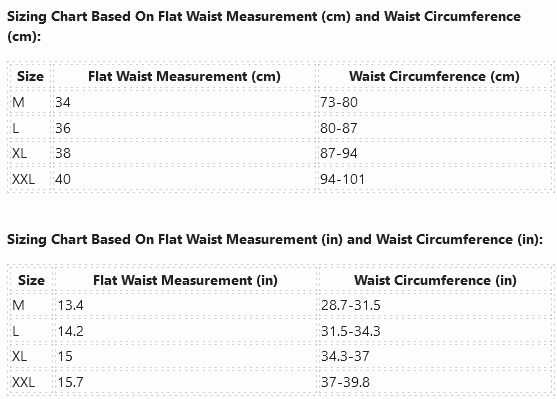 Sizing Chart Based On Flat Waist Measurement (cm) and Waist Circumference (cm):