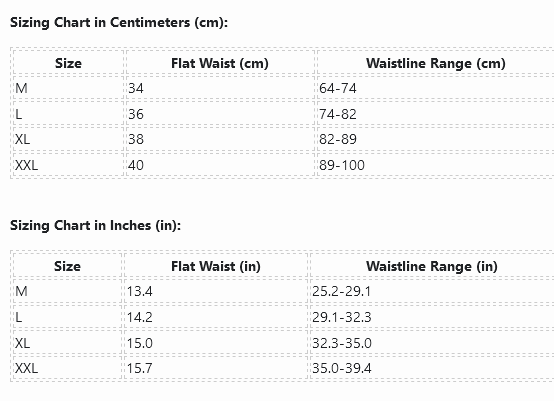 | Size | Flat Waist (cm) | Waistline Range (cm) |