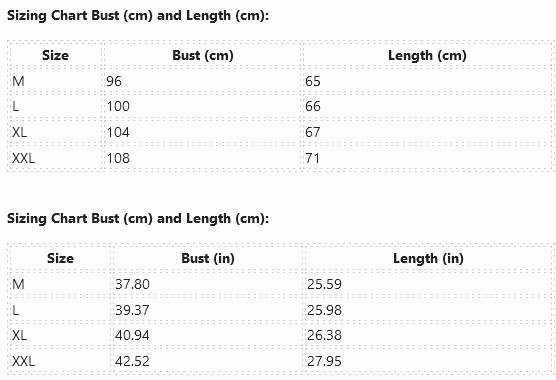 | Size | Bust (cm) | Length (cm) |