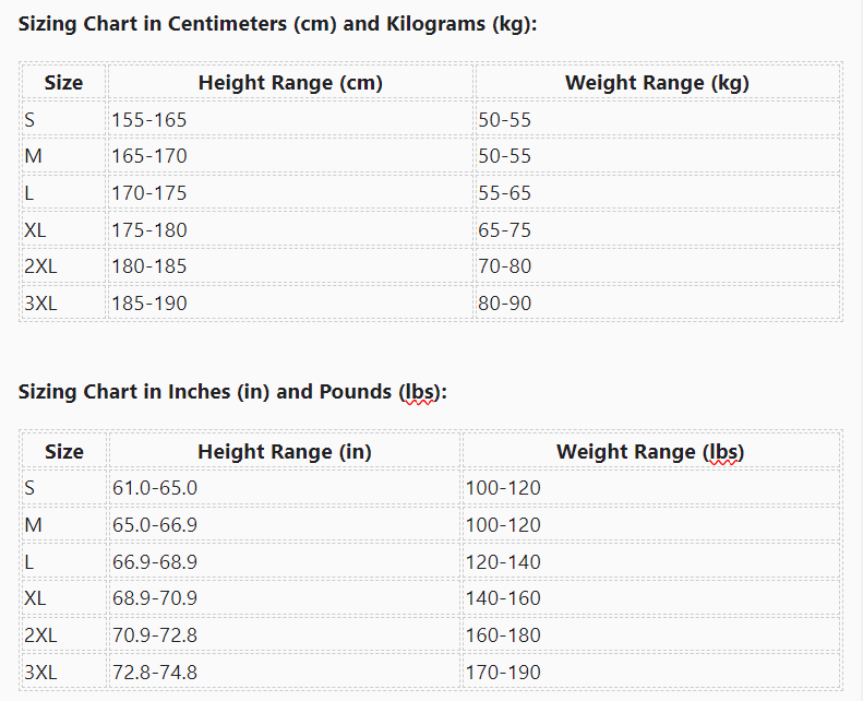 Sizing Chart in Inches (in) and Pounds (lbs):