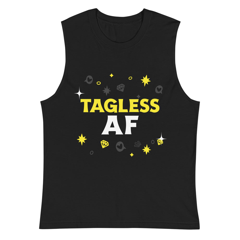 Let's not just wear the Tagless Af Muscle Tank; let's werk it, serve it, and slay in it, turning every sidewalk into a runway and every glance into an ovation. It's time to live out loud, love hard, and sparkle like the fierce, fabulous beacon of queer magnificence you are. Honey, the world isn't ready for you—but it needs you none the less! .