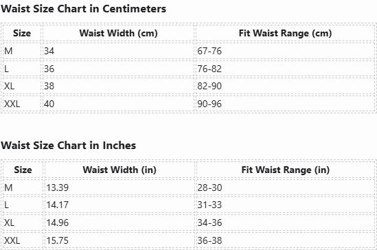 | Size | Waist Width (cm) | Fit Waist Range (cm) |