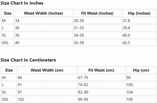 | Size | Waist Width (Inches) | Fit Waist (Inches) | Hip (Inches) |