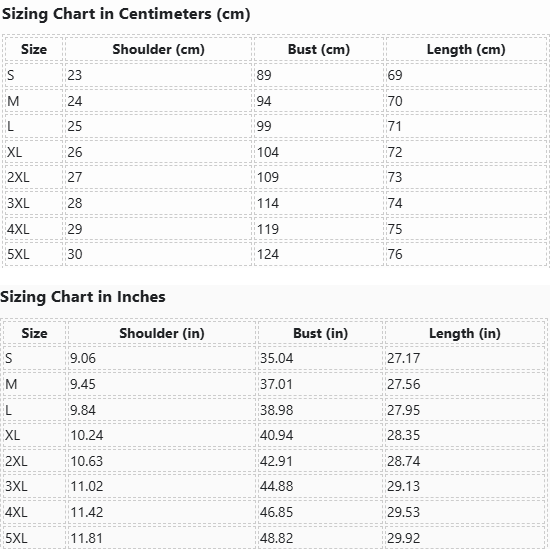 | Size | Shoulder (cm) | Bust (cm) | Length (cm) |