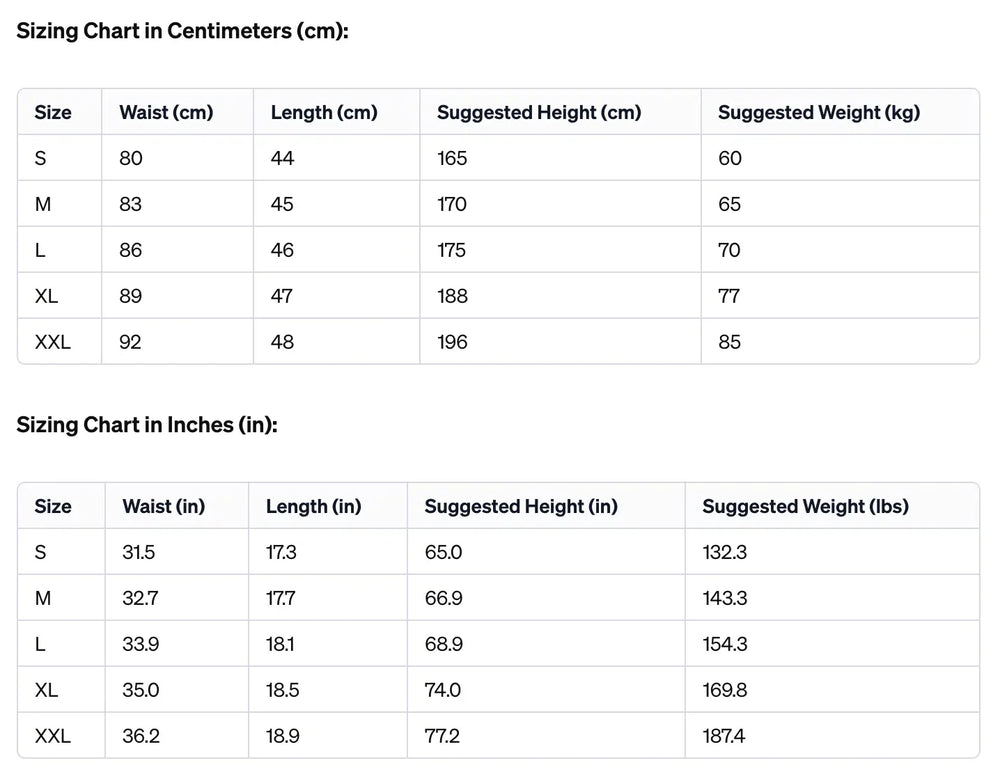 | Size | Waist (cm) | Length (cm) | Suggested Height (cm) | Suggested Weight (kg) |