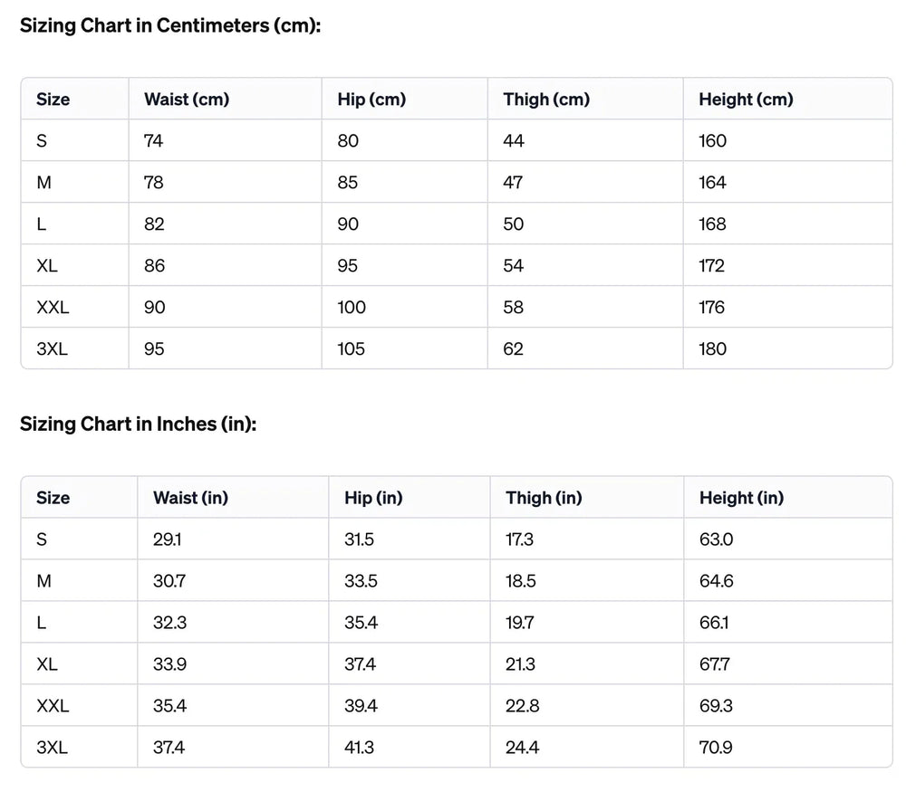 | Size | Waist (in) | Hip (in) | Thigh (in) | Height (in) |