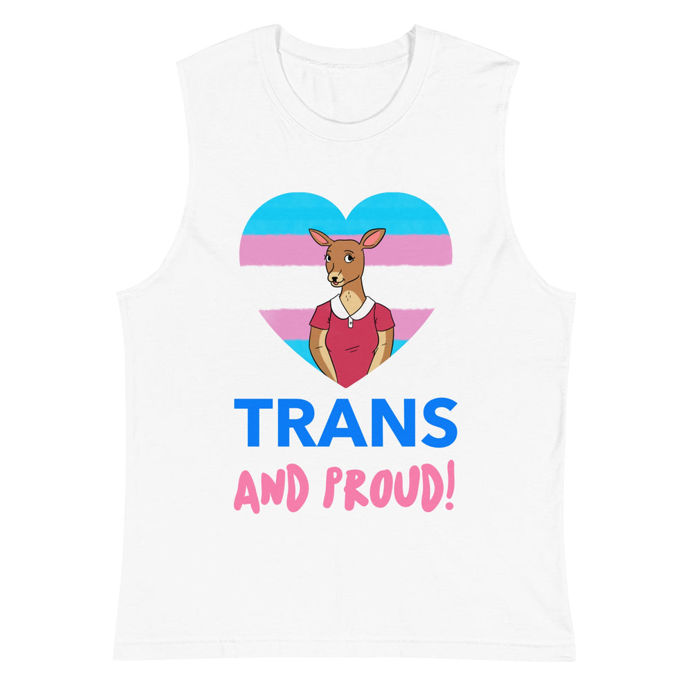 Let's not just wear the Trans & Proud Muscle Tank; let's werk it, serve it, and slay in it, turning every sidewalk into a runway and every glance into an ovation. It's time to live out loud, love hard, and sparkle like the fierce, fabulous beacon of queer magnificence you are. Honey, the world isn't ready for you—but it needs you none the less! .