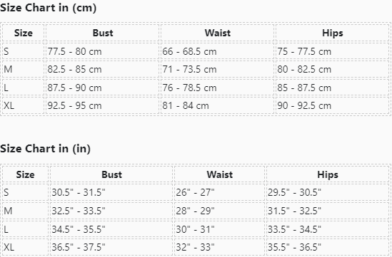 | Size | Bust | Waist | Hips |