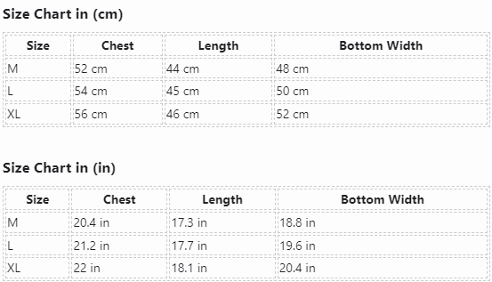 | Size | Chest | Length | Bottom Width |