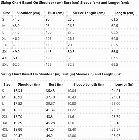Sizing Chart Based On Shoulder (cm) Bust (cm) Sleeve (cm) and Length (cm):