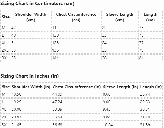 | Size | Shoulder Width (cm) | Chest Circumference (cm) | Sleeve Length (cm) | Length (cm) |