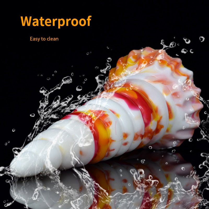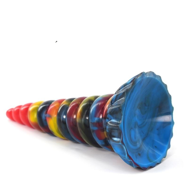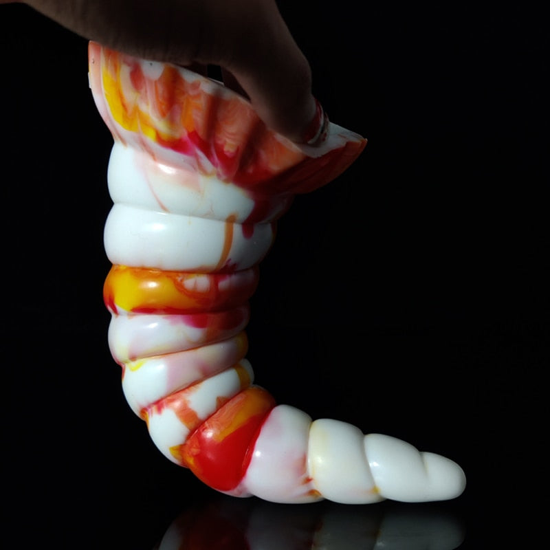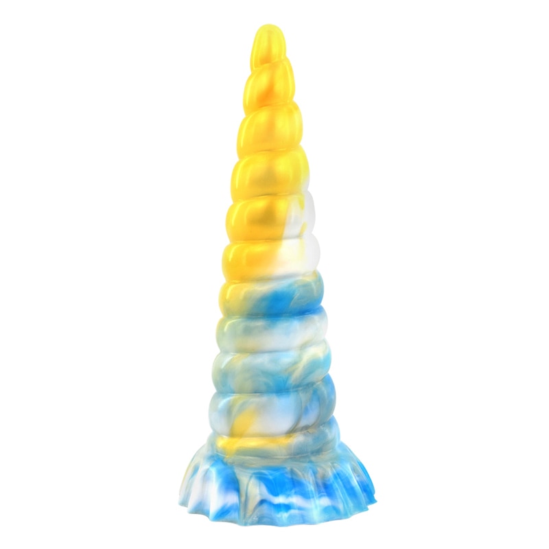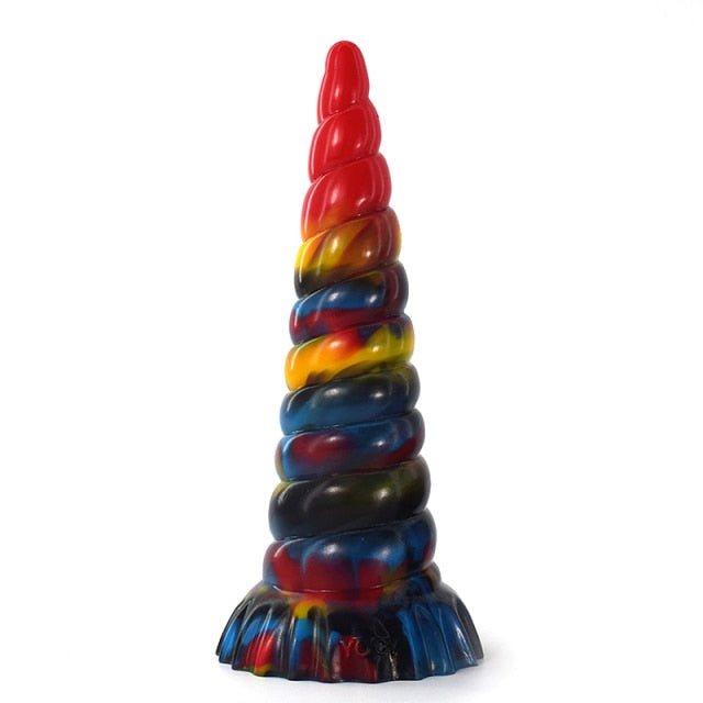 Made from silicone, it's got a ridged texture that hits the right spots. It comes in different rainbow motifs for a life-fun twist. Although it's shaped like a horn, the end is blunted, so it's safe to use. It's also got a suction mechanism at its base so that it can be attached to any surface.