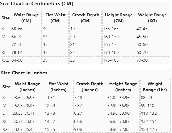 | Size | Waist Range (CM) | Flat Waist (CM) | Crotch Depth (CM) | Height Range (CM) | Weight Range (KG) |