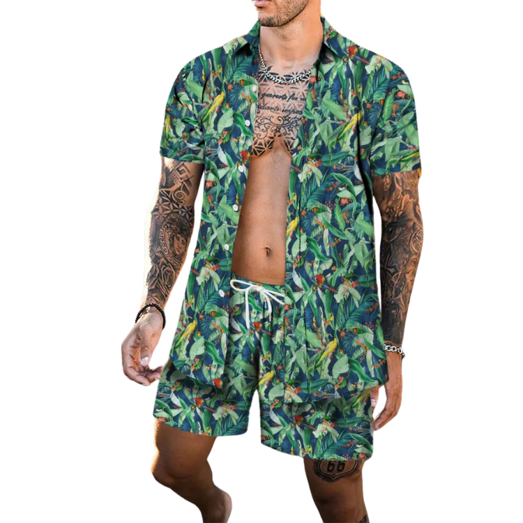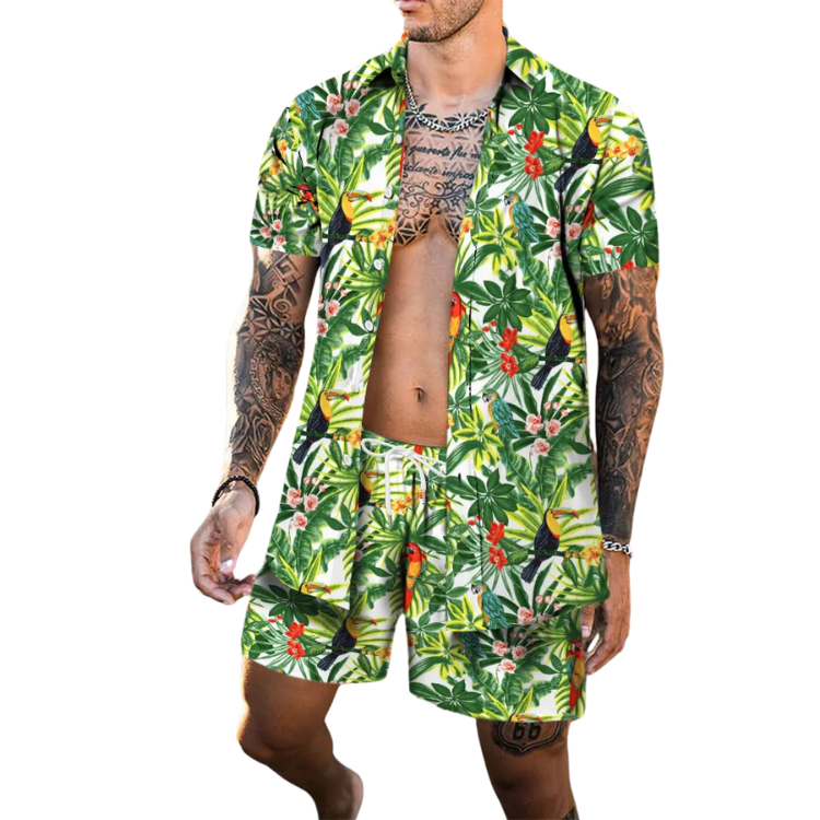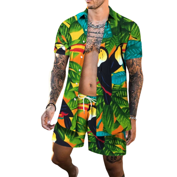 Imagine stepping onto the sands in an ensemble that captures the very essence of island paradise—bold, breezy, and unapologetically bright. The shirt flutters with every gentle sea breeze, a canvas of vibrant colors that mirror the exotic blooms of a tropical haven. The shorts offer a playful contrast, snug and stylish, perfect for showing off those dance moves by the shoreline or lounging luxuriously by the pool.