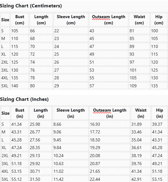 | Size | Bust (cm) | Length (cm) | Sleeve Length (cm) | Outseam Length (cm) | Waist (cm) | Hip (cm) |
