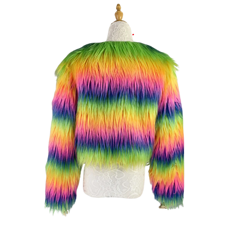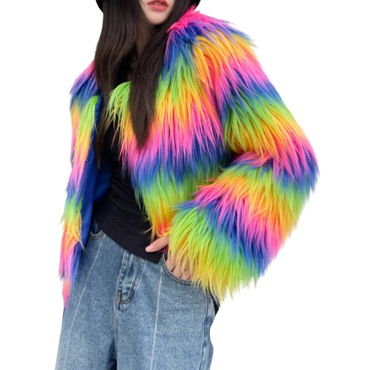 Step out in style that shouts your pride from every fiber—introducing the Vividly Fierce Rainbow Queer Glam Coat. This fabulous fur coat isn’t just a garment; it's a statement. With its riot of rainbow colors, it’s here to make sure you’re not just seen but remembered.