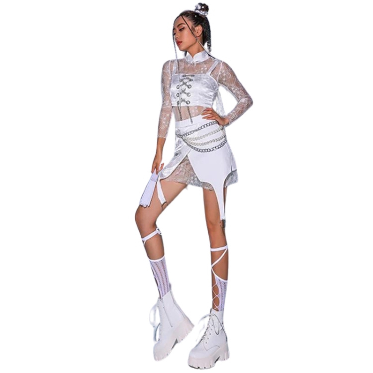 Unleash your inner rhythm and style with the White Lace Hip Hop Outfit – a fusion of elegance and street edge designed to turn heads and amplify your moves. This ensemble isn't just clothing; it's a statement of boldness and beauty, tailored to accentuate your figure and flair. Whether you're dropping beats or simply dropping by, this outfit ensures you do it with unforgettable panache.