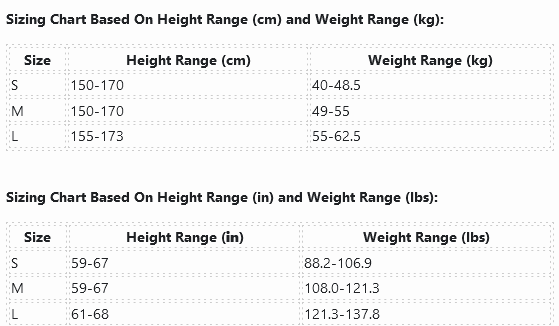 Sizing Chart Based On Height Range (cm) and Weight Range (kg):