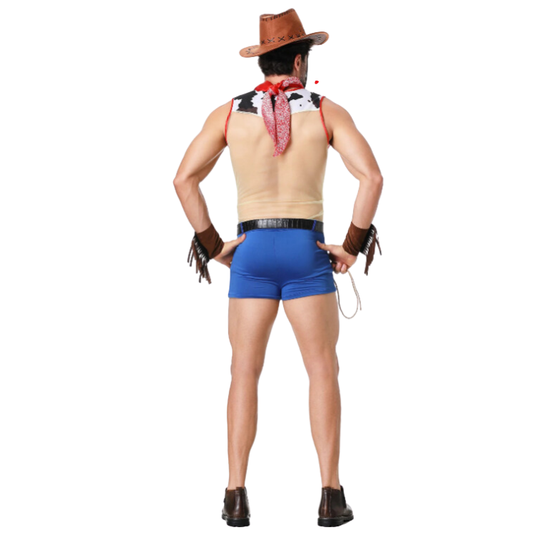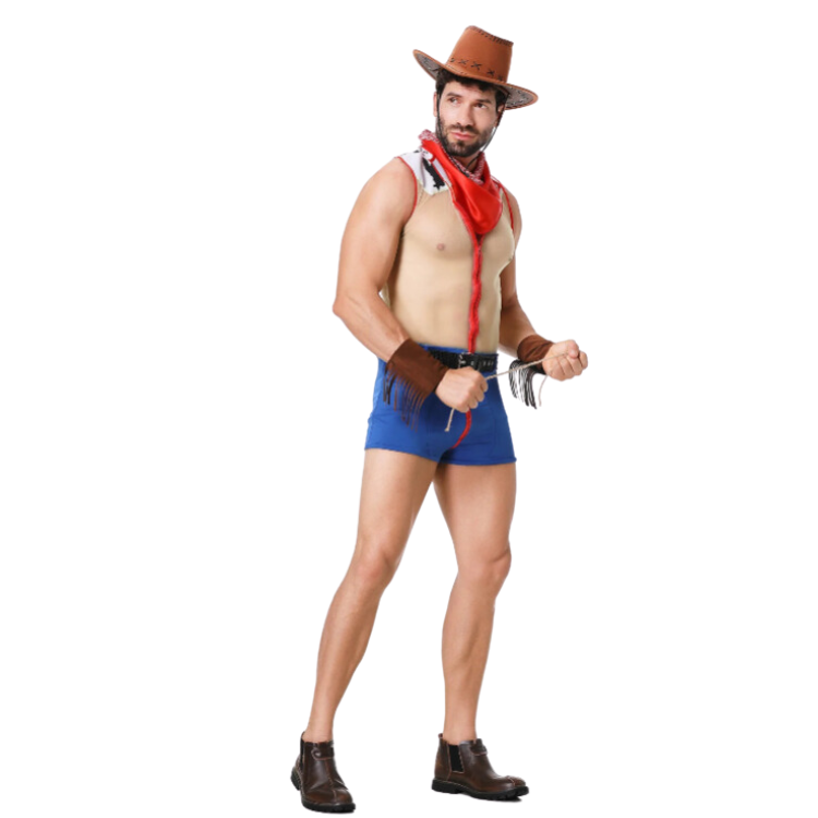 Embrace your inner cowboy with pride! This outfit, though initially crafted with the male physique in mind, transcends gender norms, welcoming individuals of all identities to partake in its playful promise. After all, in the wild, wild world of queer celebration, gender is nothing but a social construct, and fabulousness knows no bounds.