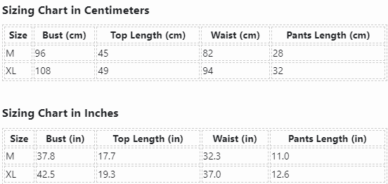 | Size | Bust (cm) | Top Length (cm) | Waist (cm) | Pants Length (cm) |