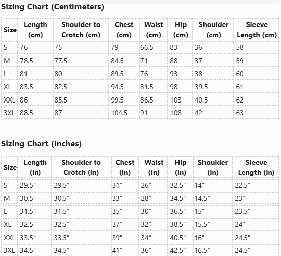 | Size | Length (in) | Shoulder to Crotch (in) | Chest (in) | Waist (in) | Hip (in) | Shoulder (in) | Sleeve Length (in) |
