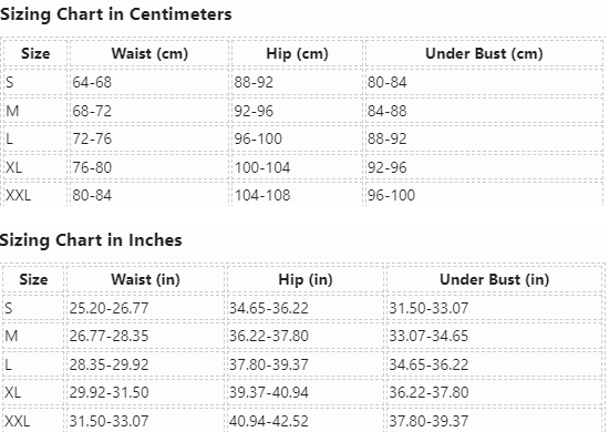 | Size | Waist (in) | Hip (in) | Under Bust (in) |
