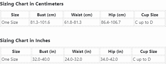 | Size | Bust (in) | Waist (in) | Hip (in) | Cup Size |