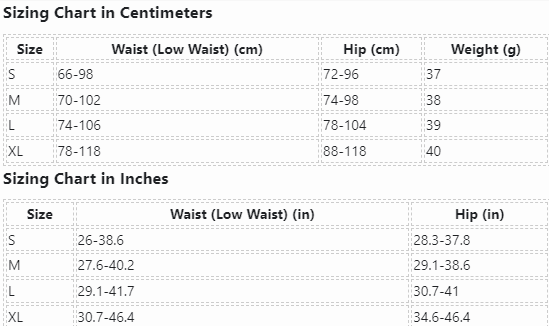 | Size | Waist (Low Waist) (cm) | Hip (cm) | Weight (g) |